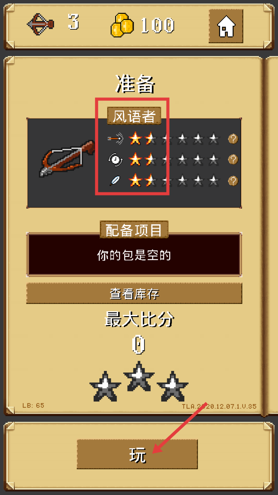 1、查看【风语者】弩的属性,确认金币-100,点击【玩】按钮开启战斗,做好战前准备。