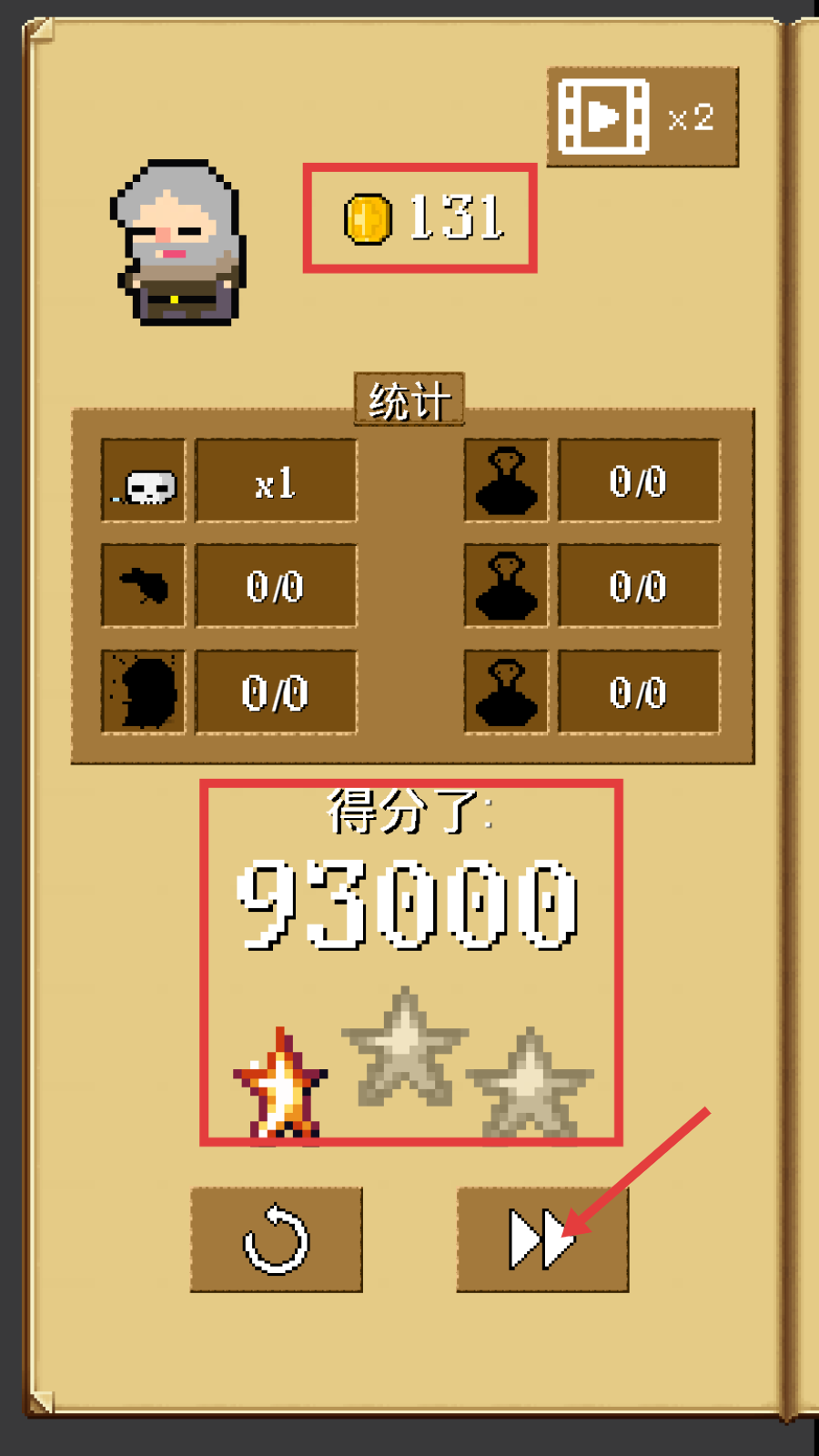 4、关卡结算时,关注金币-131和得分-93000,点击继续按钮推进游戏,积累资源与分数。