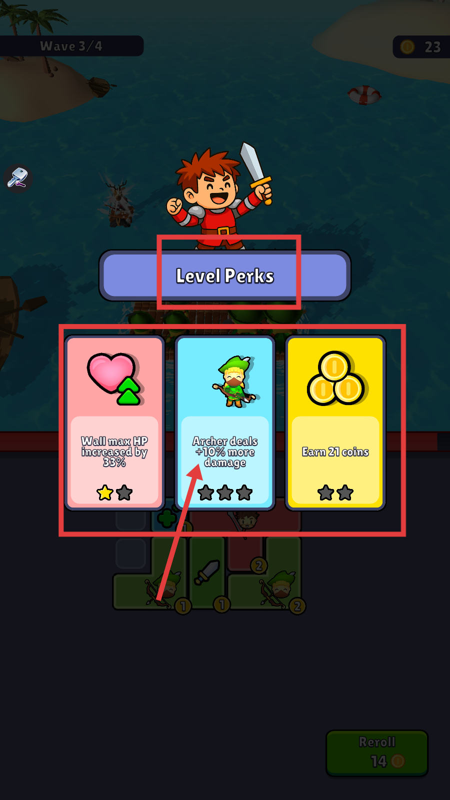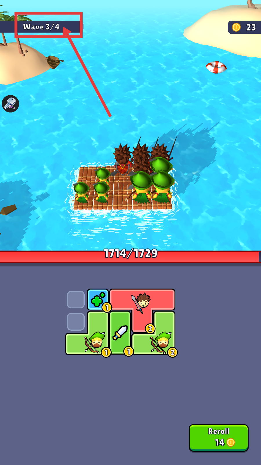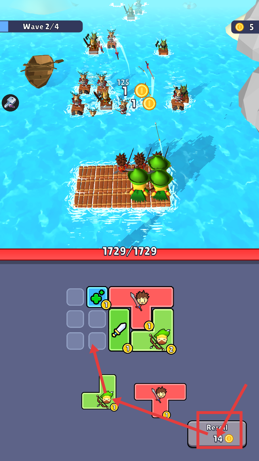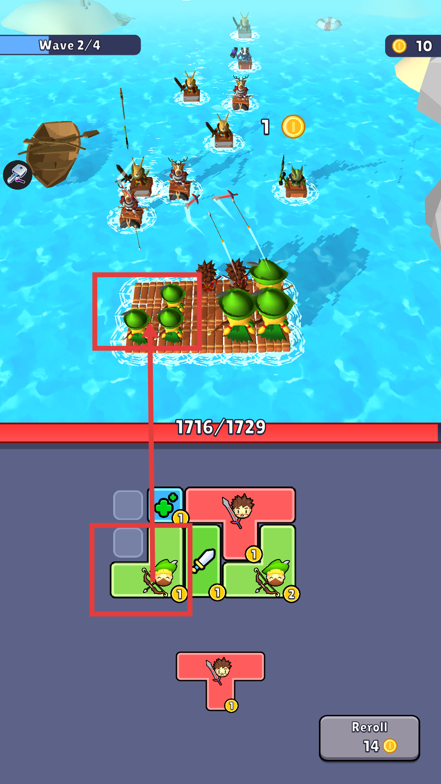 1、在Wave-2/4时,利用【Reroll-14】金币调整角色布局,合理放置战士与弓箭手,应对敌方船只进攻。