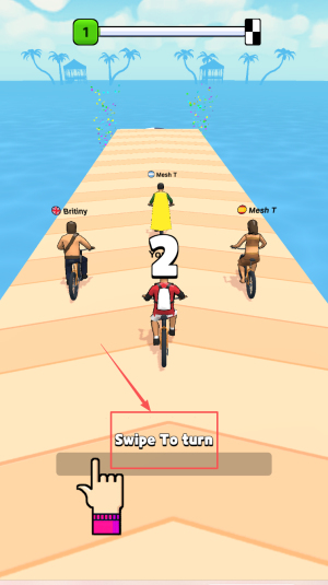 1、开启水上竞速:进入游戏选择模式,明确 “骑单车避障、冲线拿第一” 目标,熟悉单车控制与竞速操作逻辑,做好闯关准备。