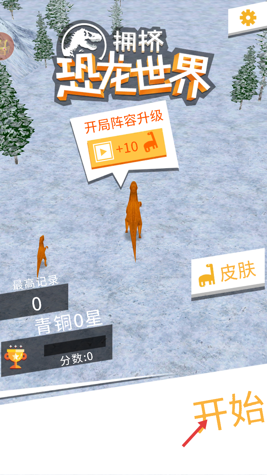 1、进入【拥挤恐龙世界】后,先点击【开始】,可通过观看视频完成【开局阵容升级+10】恐龙,提升初始战力。