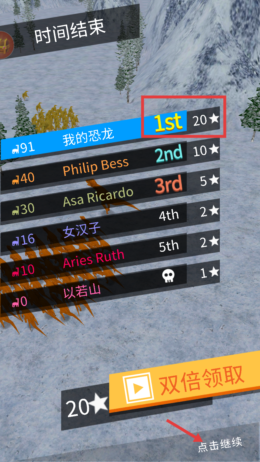 4、时间结束后,若取得【1st】排名可获得大量星星奖励,记得点击【点击继续】或观看视频【双倍领取】奖励,积累星星提升实力。