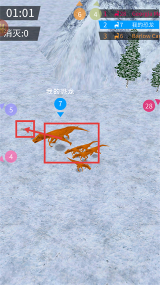 2、冒险中操控【我的恐龙】群,优先吞噬数量比自己少的恐龙(如数字5的恐龙),快速壮大种群,同时留意【消灭】计数和剩余时间。