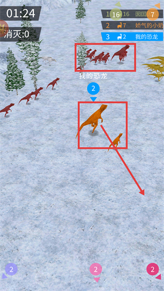 3、遇到数量多的敌方恐龙群(如红色大群)时,注意走位躲避,专注合并小恐龙(如数字2的恐龙)来提升自身恐龙数量,避免被吞并。