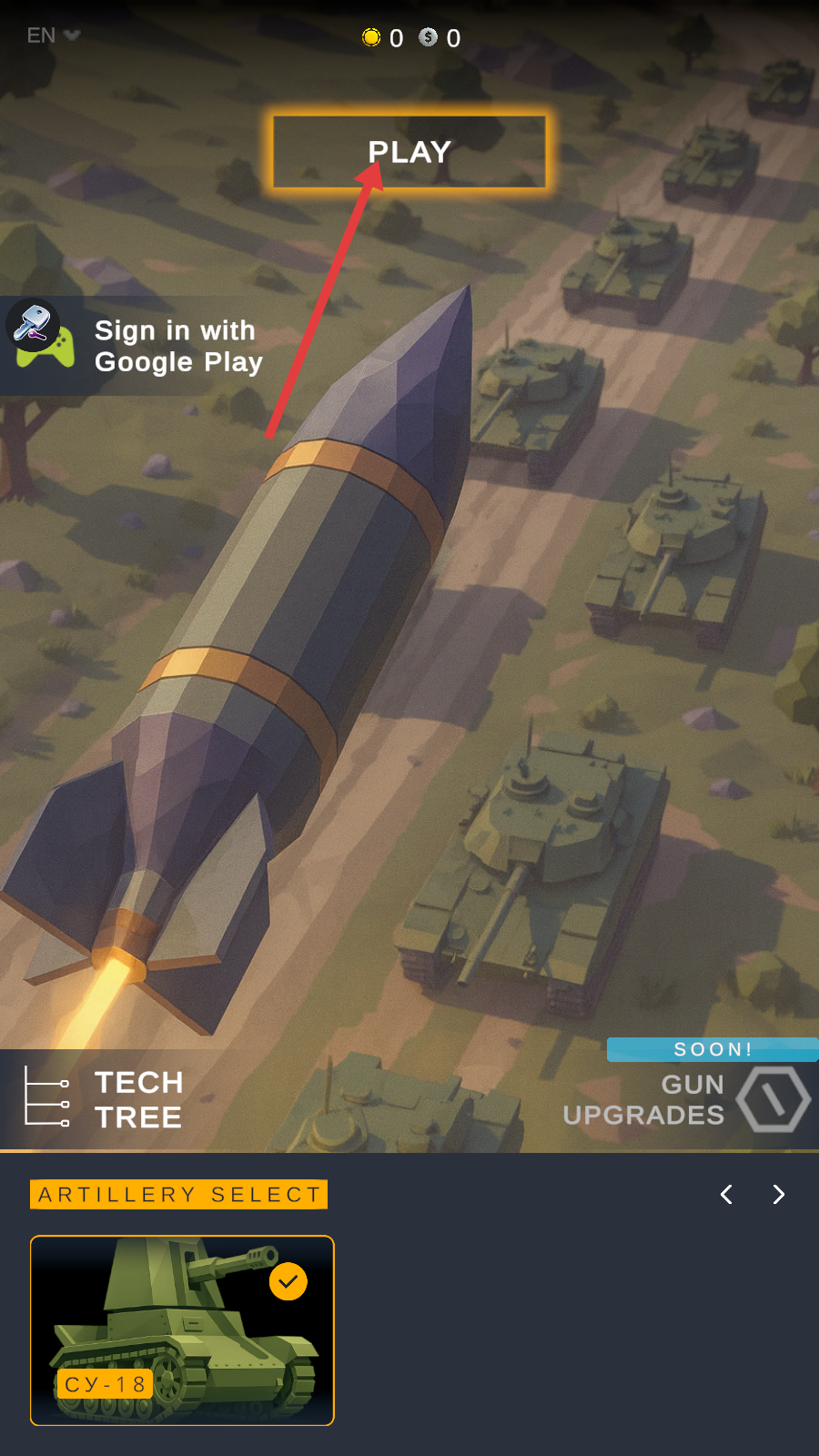 1、进入游戏后点击【PLAY】,选择【CY-18】火炮,开启军事射击挑战之旅。