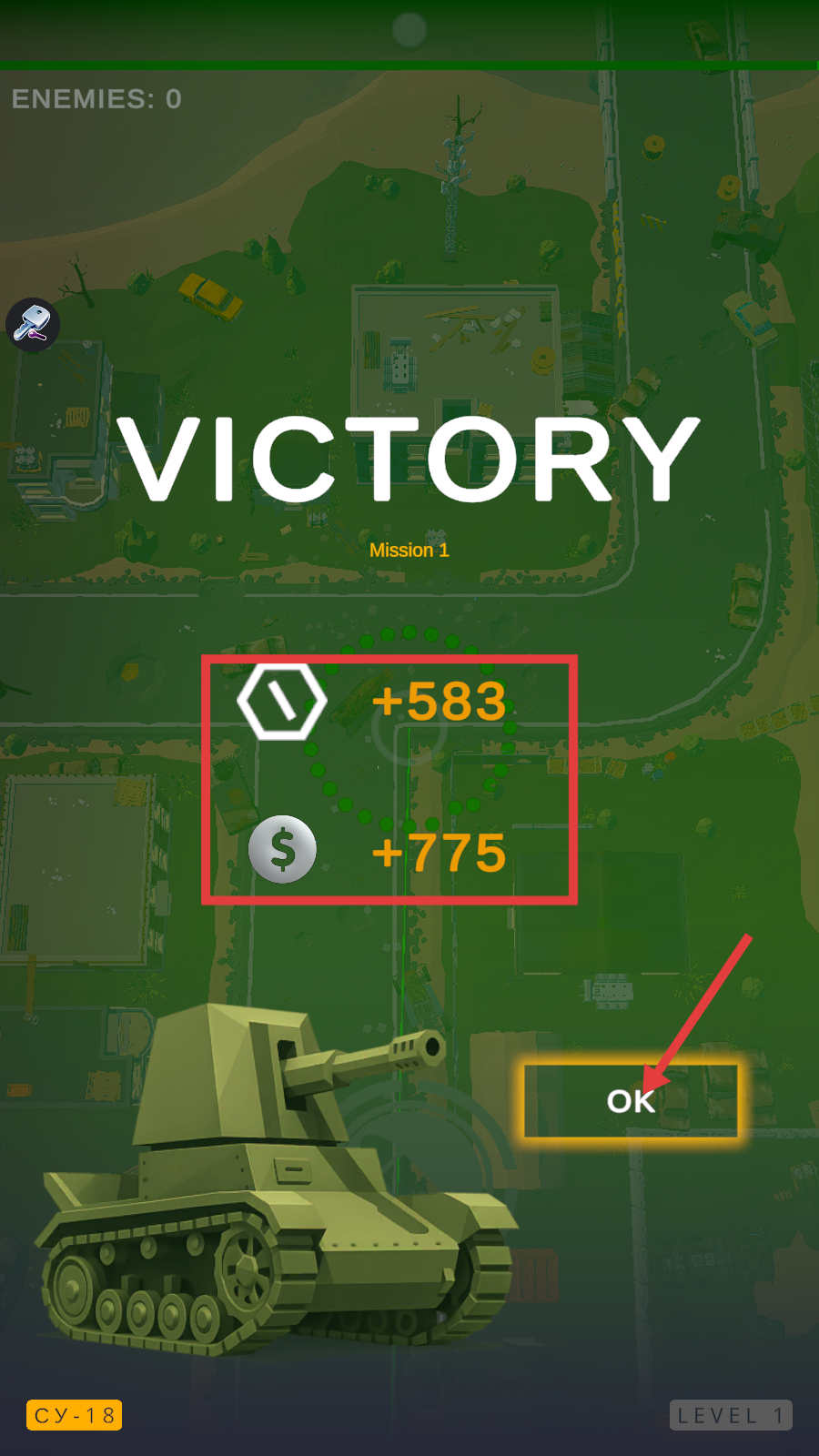 4、胜利后可获得资源【+583】和【+775-金币】,点击【OK】继续挑战,积累资源升级火炮。