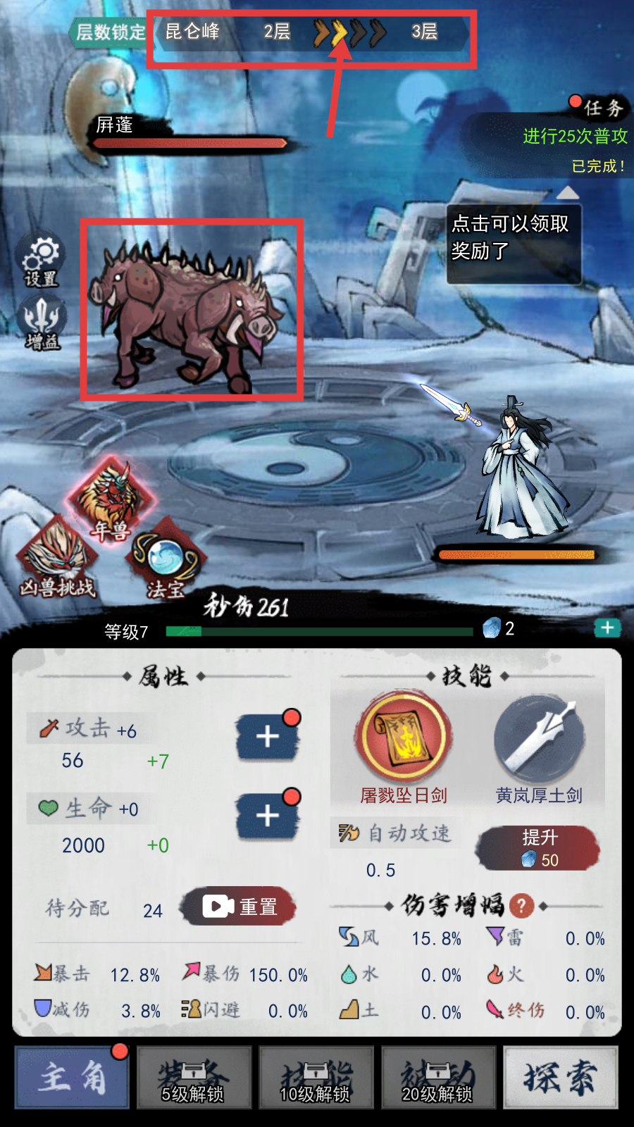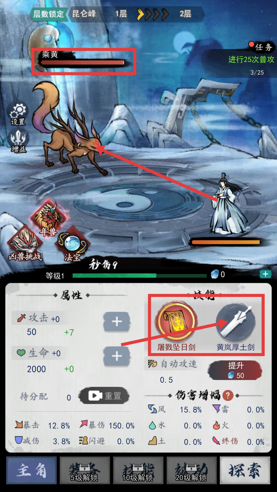 2、战斗时面对【乘黄】等怪物,合理使用【屠戮坠日剑】【黄岚厚土剑】技能,同时完成【进行25次普攻】任务提升进度。