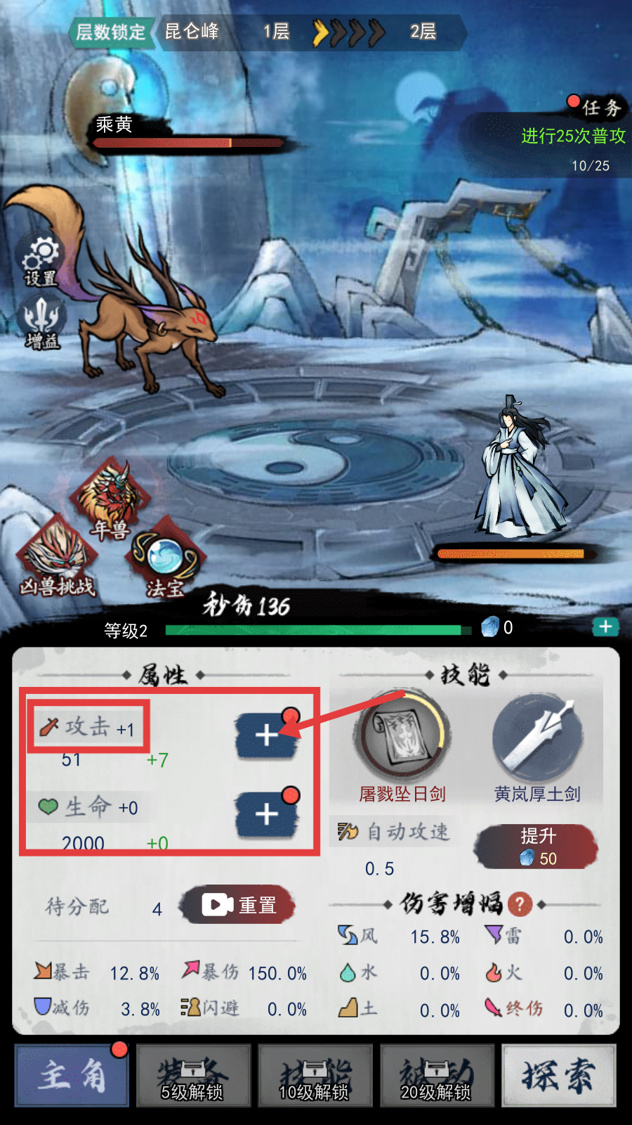 3、升级后及时点击属性栏的【攻击+1】等加号按钮,提升战力,为后续战斗和探索做好准备。