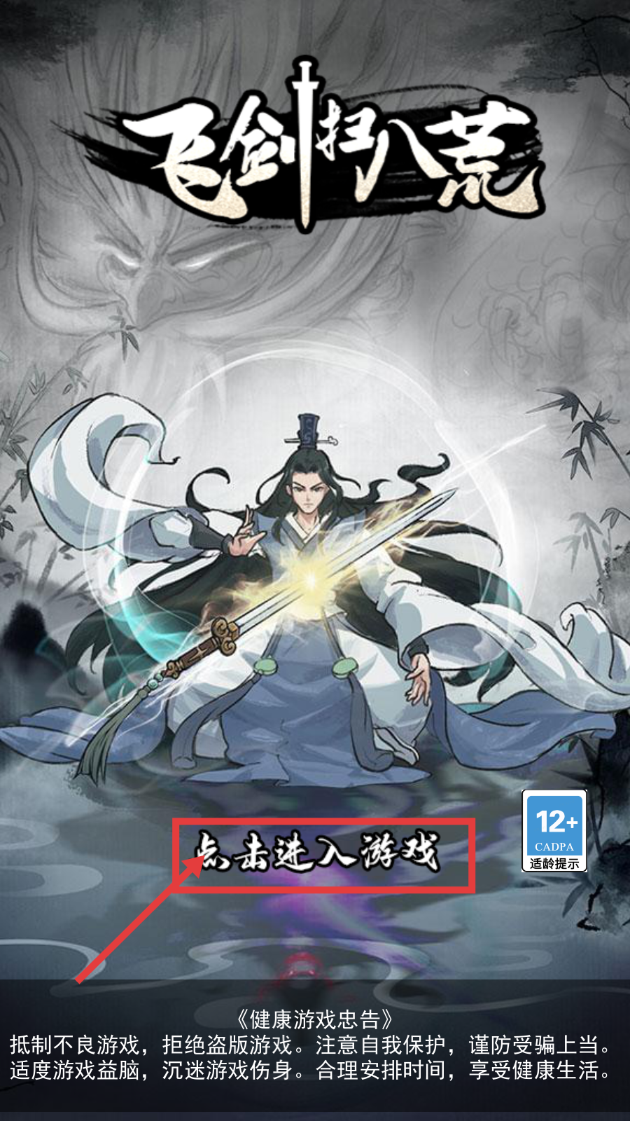1、进入游戏第一步,点击【点击进入游戏】按钮,开启【飞剑扫八荒】的修仙冒险之旅,注意查看【12+-CADPA适龄提示】。