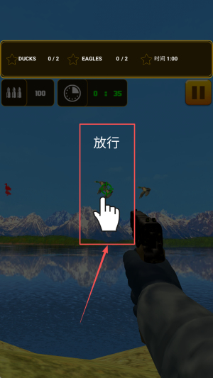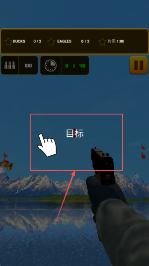 2、用远视距瞄目标:开启超远视距,瞄准远处水鸭子,调整角度与力度,确保精准命中,顺利完成关卡要求的射击任务。