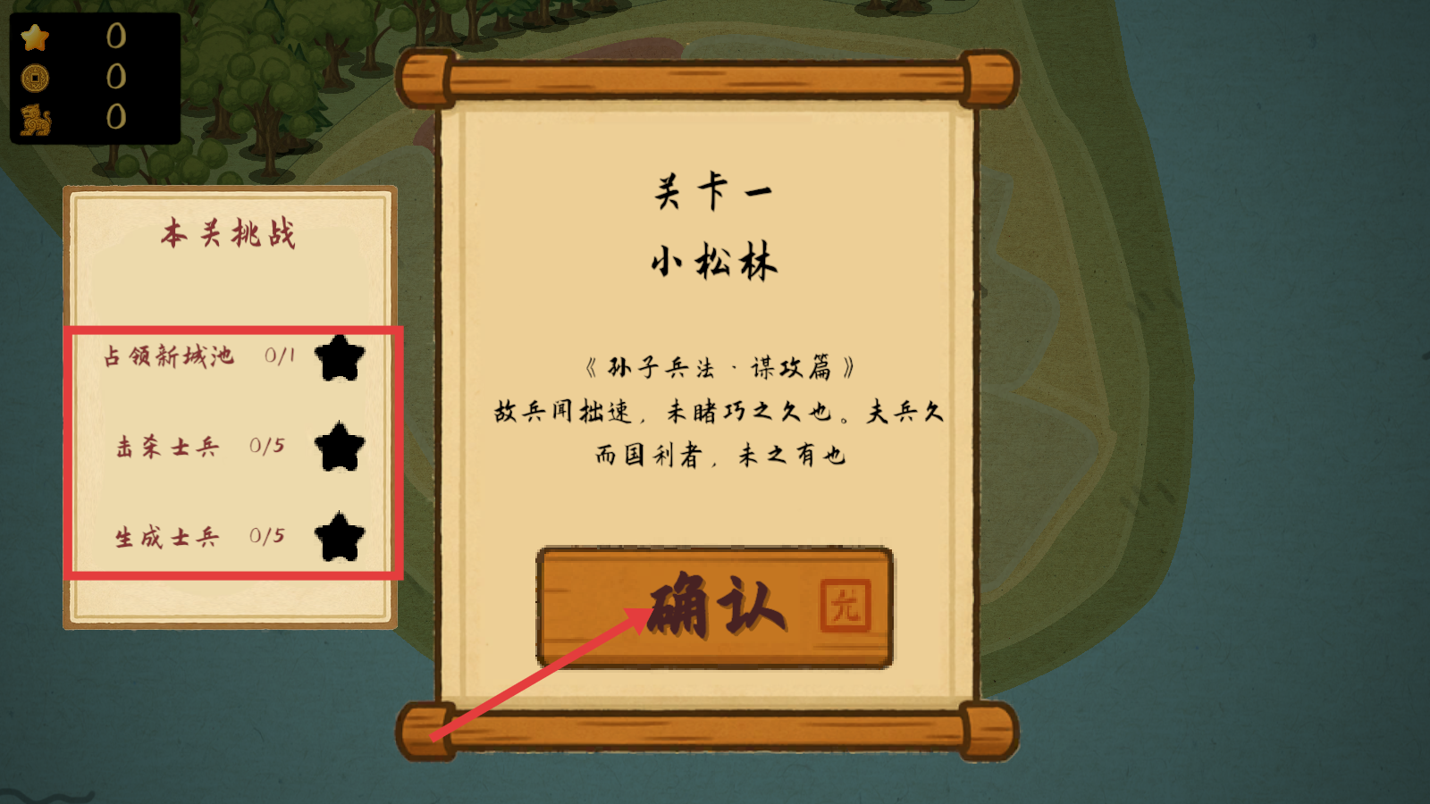 1、进入【关卡一-小松林】前,确认本关挑战【占领新城池-0/1】【击杀士兵-0/5】【生成士兵-0/5】,明确目标后点击【确认】开启关卡。