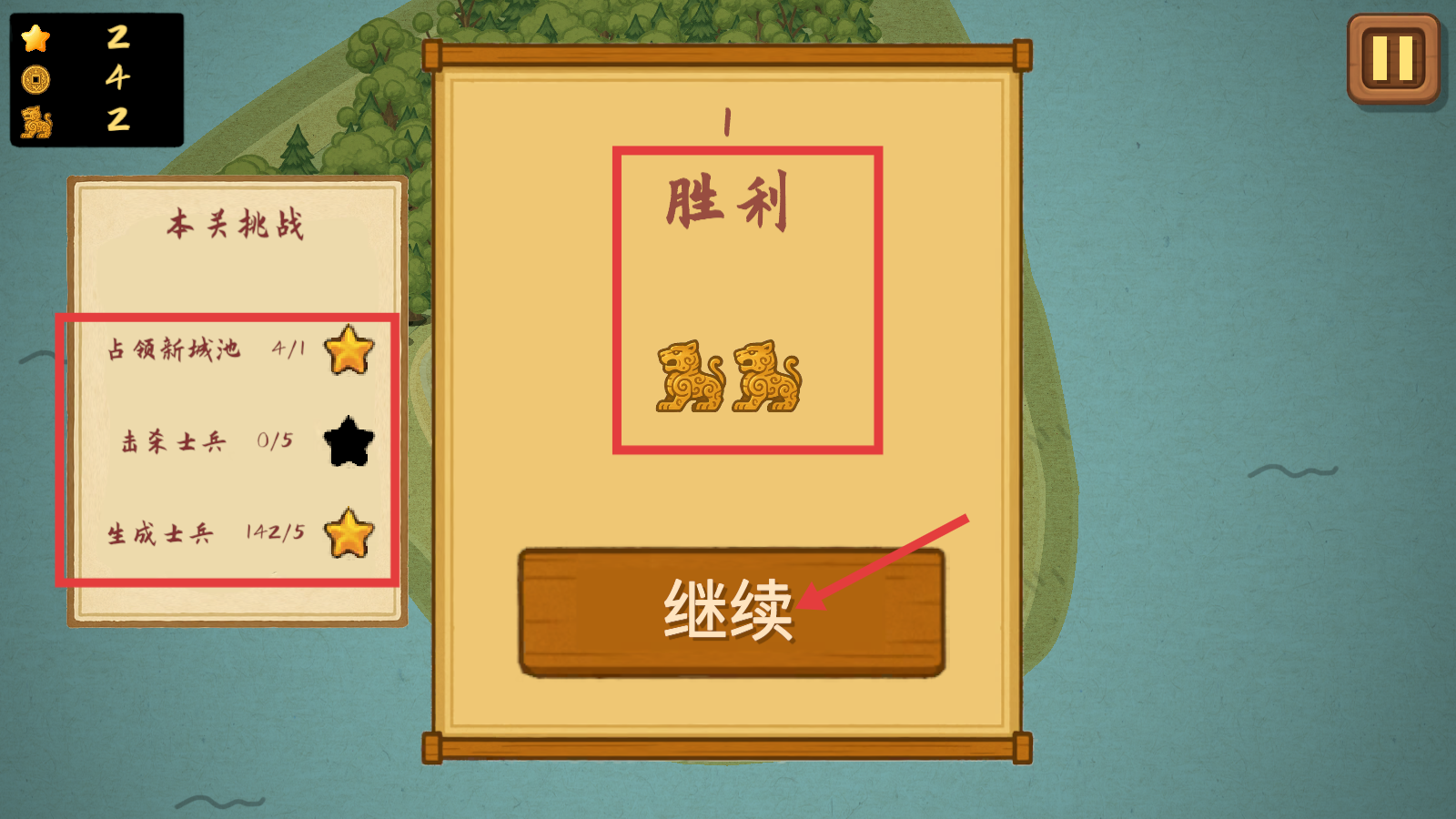 4、关卡胜利后点击【继续】,关注【占领新城池-4/1】【击杀士兵-0/5】【生成士兵-142/5】的任务完成情况,为后续关卡积累进度。