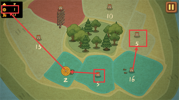 2、要关注左上角金币资源,通过占领城池(如标有3的城池)获取金币,同时合理规划城池兵力(如标有5的城池),为持续扩张做准备。