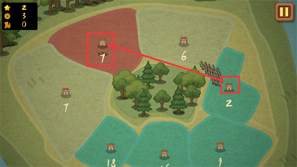 3、在地图界面,需调度士兵从兵力充足的城池(如标有2的城池)向目标城池(如标有7的城池)移动,逐步占领不同区域的城池以扩大势力。