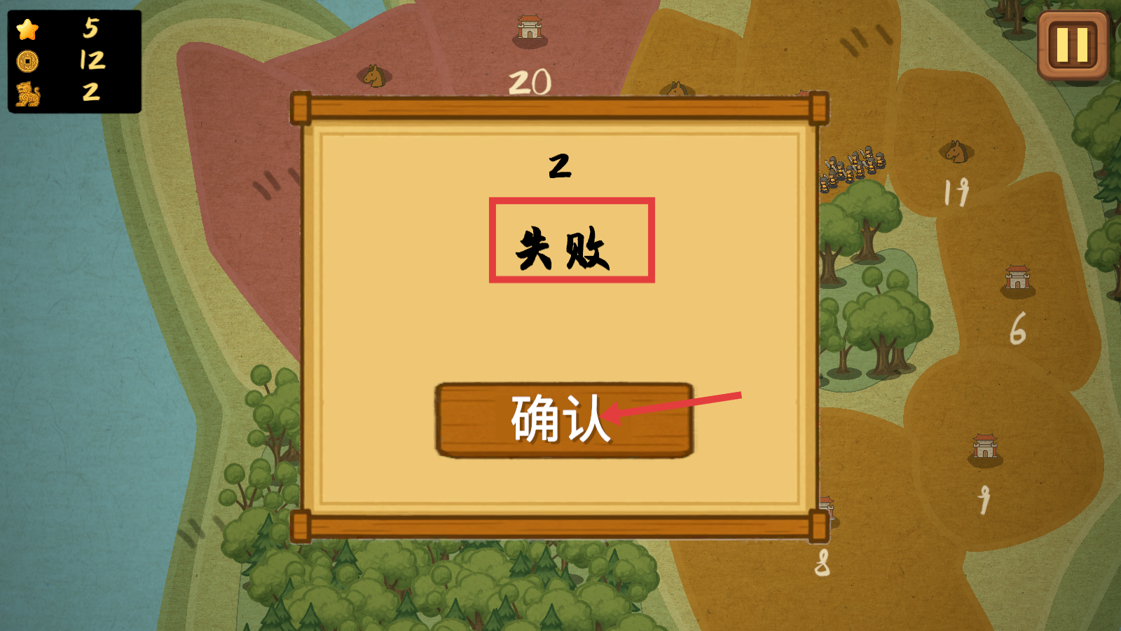 4、关卡失败后点击【确认】,关注左上角【星星-5】【金币-12】【狮子-2】的资源情况,重新规划策略,准备再次挑战。