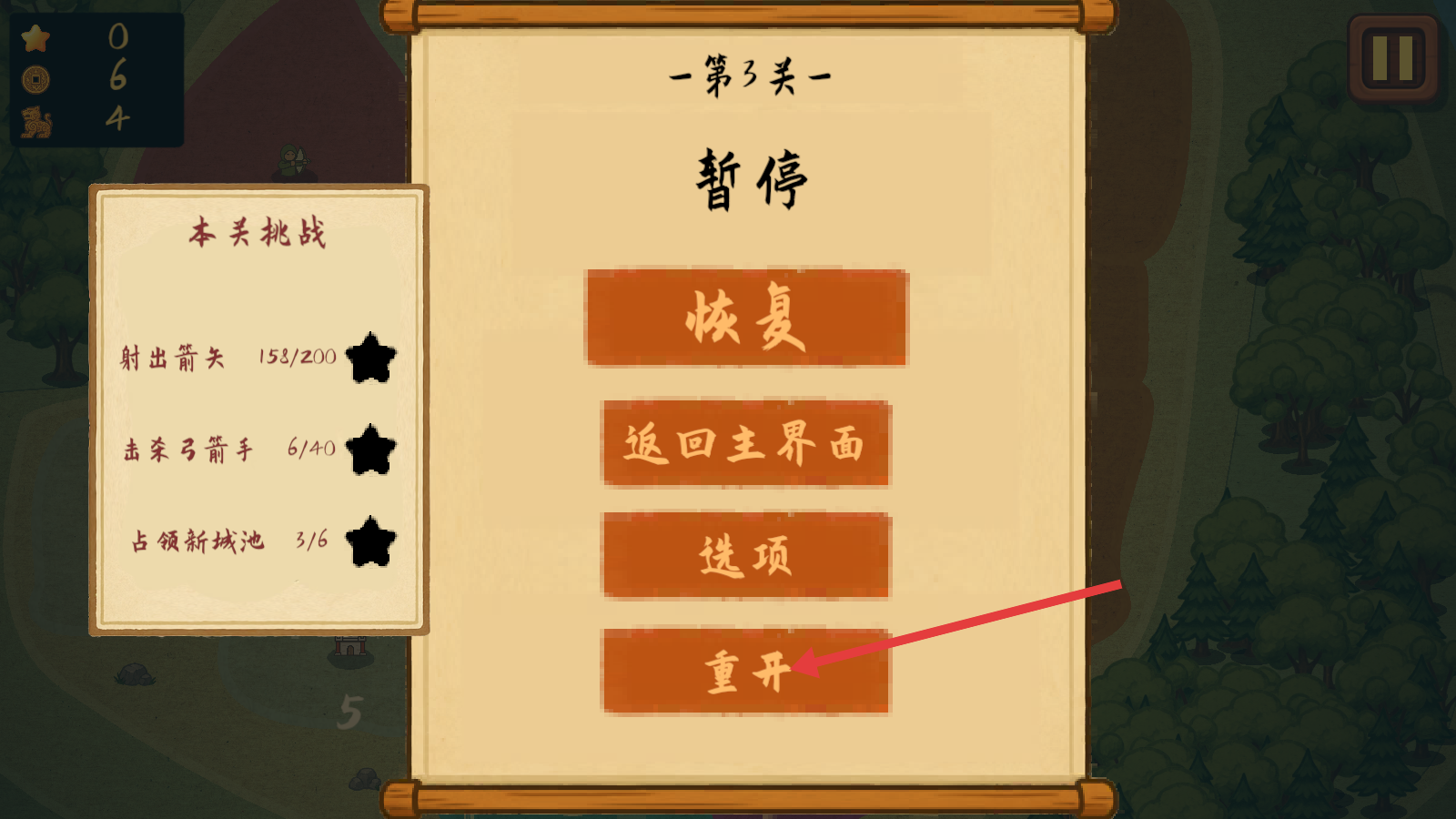 4、第3关暂停时,关注【射出箭矢-158/200】【击杀弓箭手-6/40】的任务进度,若需调整可点击【重开】,合理规划后续操作。