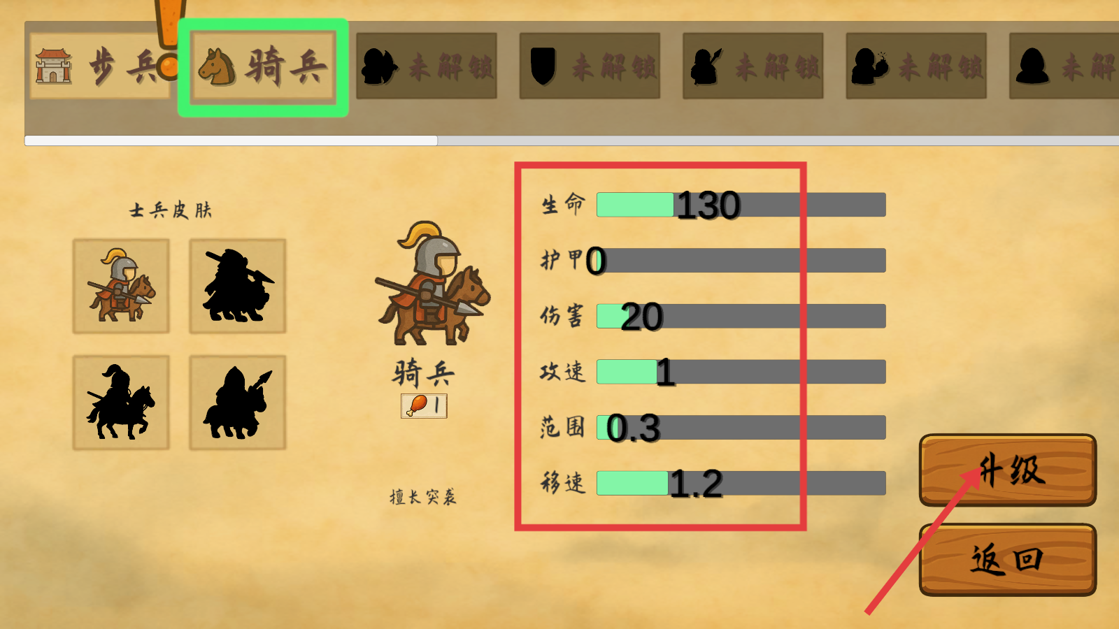 2、在骑兵界面,关注【生命-130】【伤害-20】等属性,点击【升级】提升骑兵战力,利用其擅长突袭的特点增强战斗能力。