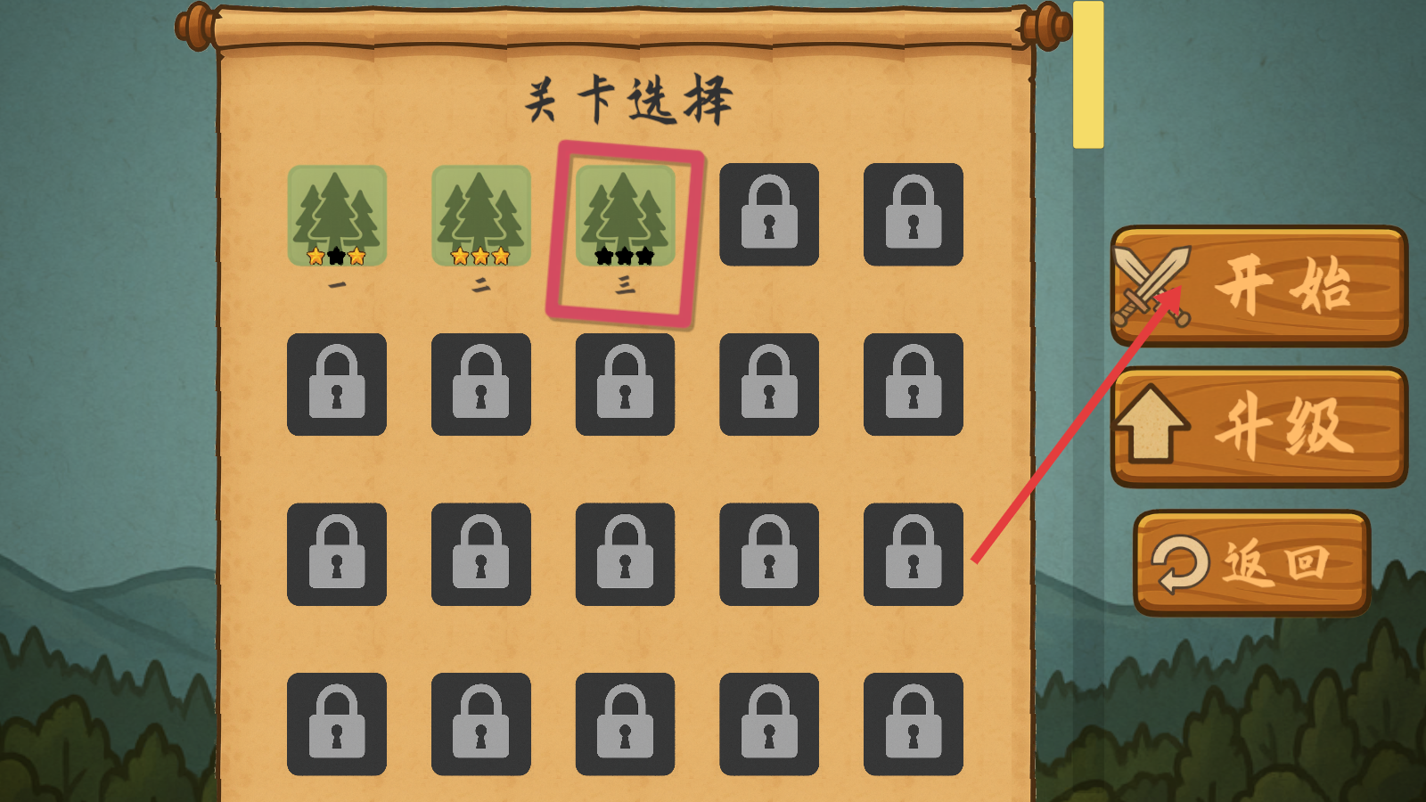 1、关卡选择界面选定第三关后,点击【开始】进入关卡,开启第3关挑战,提前规划兵力与任务完成策略。