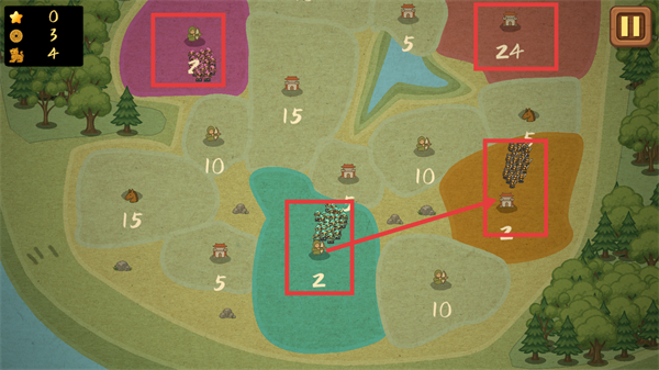 3、地图界面中,观察各区域兵力(如2、24),调度兵力从兵力充足的区域向目标区域进攻,逐步扩大势力,占领更多城池。