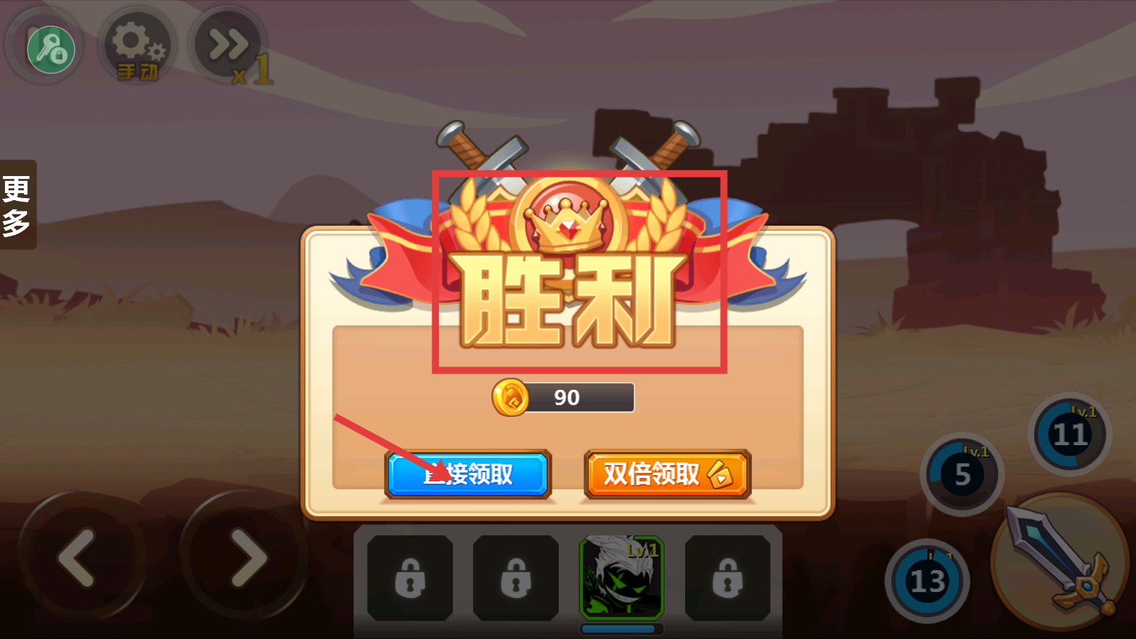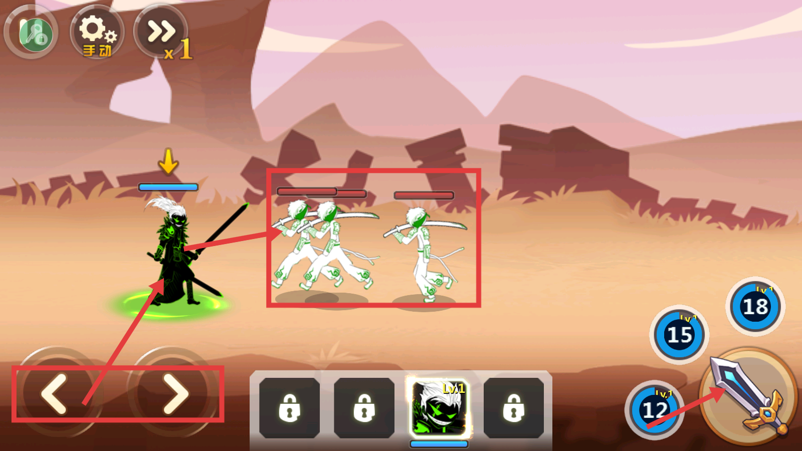 2、利用左右移动按钮调整角色位置,针对成群敌人发动武器攻击,注意走位与攻击的节奏,有效击败对手。