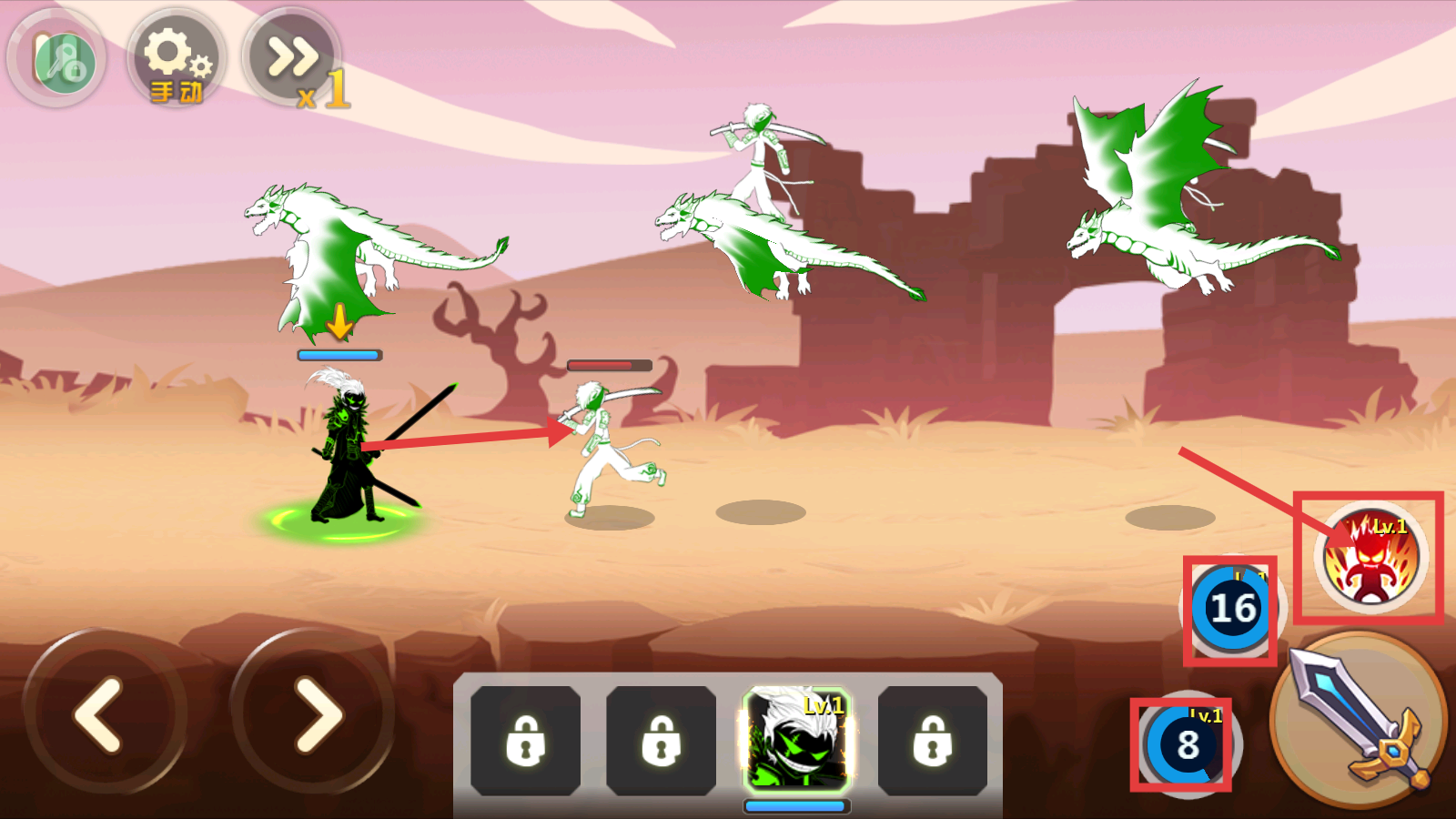 3、战斗中合理使用技能(如【Lv1】技能),关注技能冷却时间(如16、8),配合角色攻击敌人,提升战斗效率。