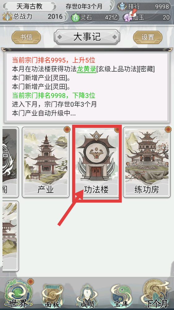 1、关注【大事记】,本月在【功法楼】获得【龙黄录-玄级上品功法】,宗门产业灵田新增,留意排名变化。