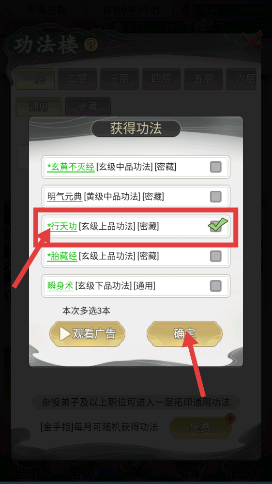 2、进入【功法楼】,选择【行天功-玄级上品功法】后点击【确定】,获取强力功法提升宗门实力。