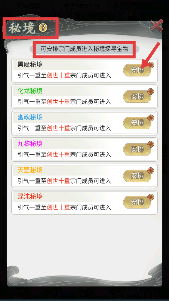 3、进入【秘境】界面,可安排宗门成员进入【黑魔秘境】等探寻宝物,点击【安排】按钮即可操作。