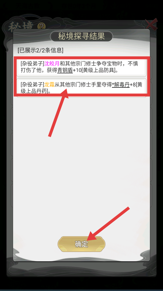 4、查看【秘境探寻结果】,杂役弟子获【青铜盾-10】【解毒丹-8】,点击【确定】继续宗门事务。