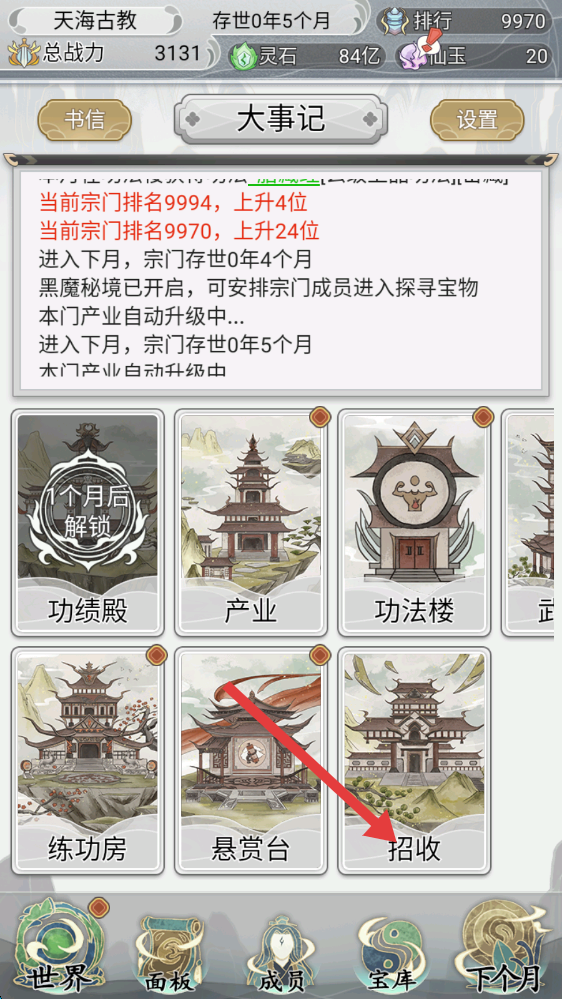 1、关注【大事记】,宗门排名持续上升,点击【招收】建筑,可扩展宗门成员数量,助力宗门发展。