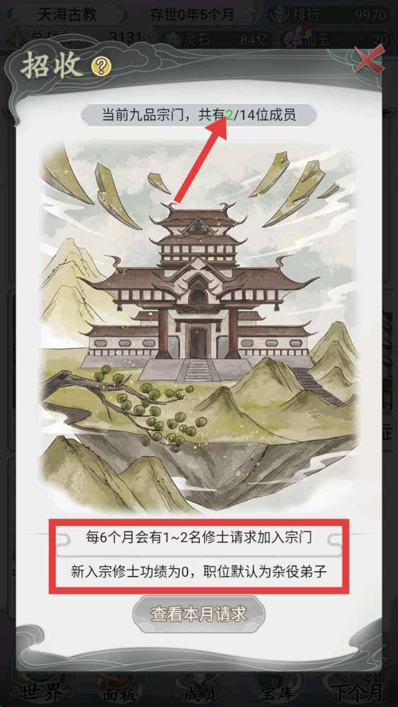 2、进入【招收】界面,了解当前成员[2/14],每6个月有1~2名修士加入,新入修士默认是杂役弟子,合理规划成员招收。