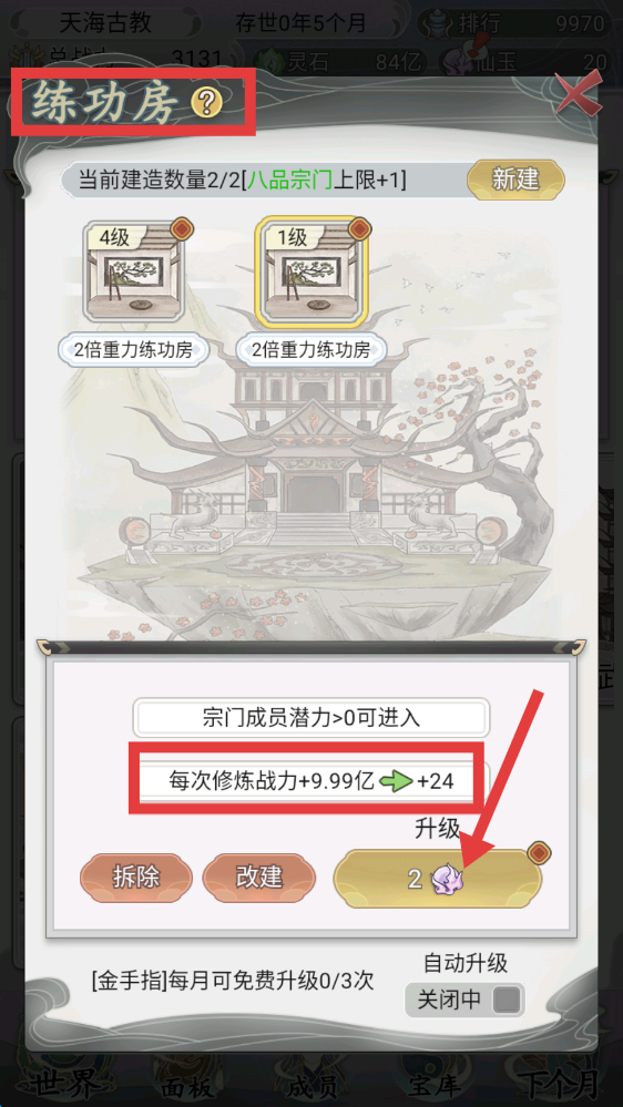 3、进入【练功房】,成员潜力>0可修炼,每次修炼战力+9.99亿,消耗仙玉升级练功房可增强修炼效果。