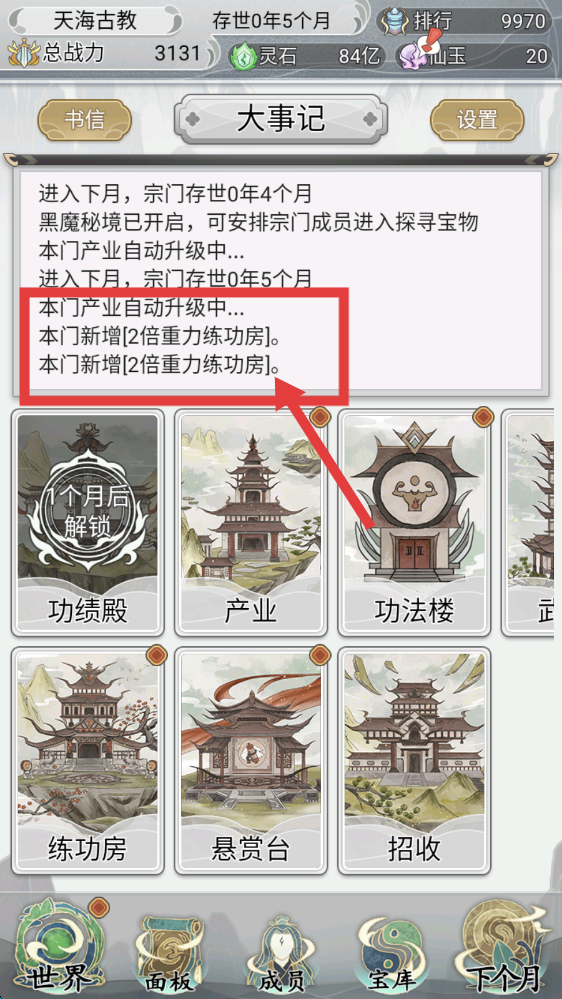 4、关注【大事记】,本门产业自动升级,新增[2倍重力练功房],借助这些信息可把握宗门发展节奏。