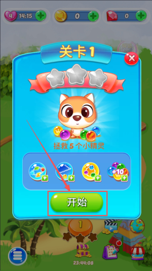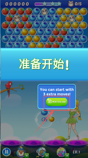 1、开启消除挑战:进入游戏选择关卡,明确 “瞄准射击、消除水果泡泡” 目标,熟悉泡泡发射角度与反弹规则,做好准备。