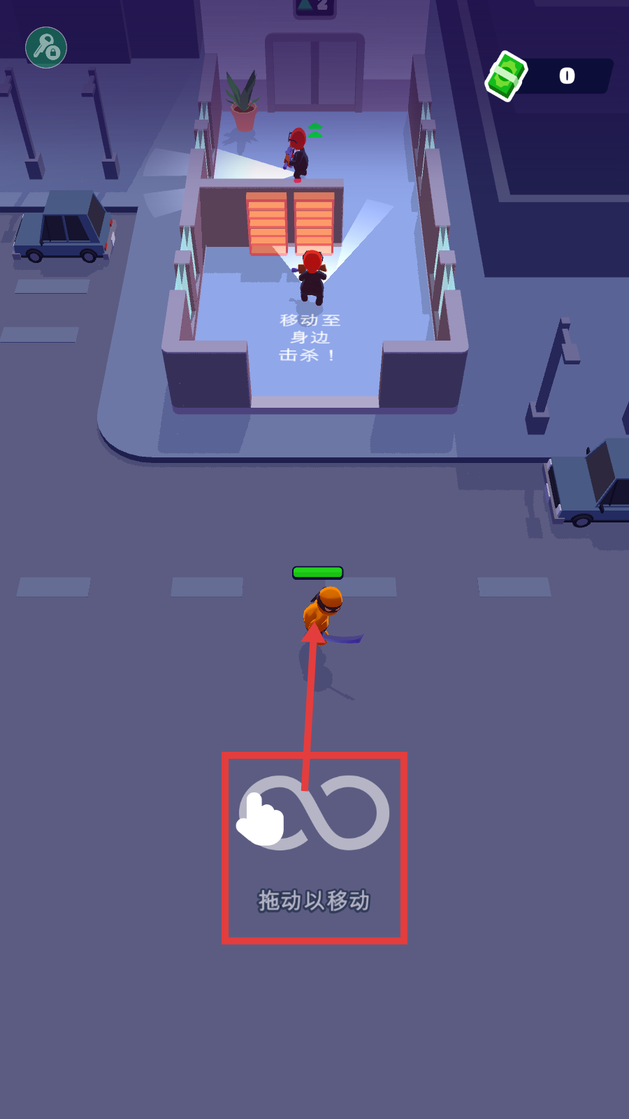 1、按照【拖动以移动】提示操作角色,精准靠近敌人后执行击杀,完成初期战斗任务。