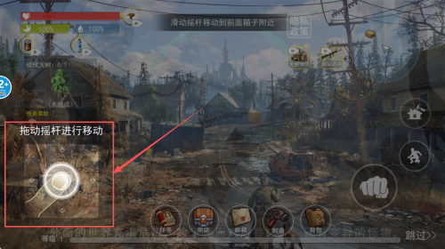 1、如何移动角色:拖动左下角的虚拟摇杆进行角色移动,探索游戏环境。