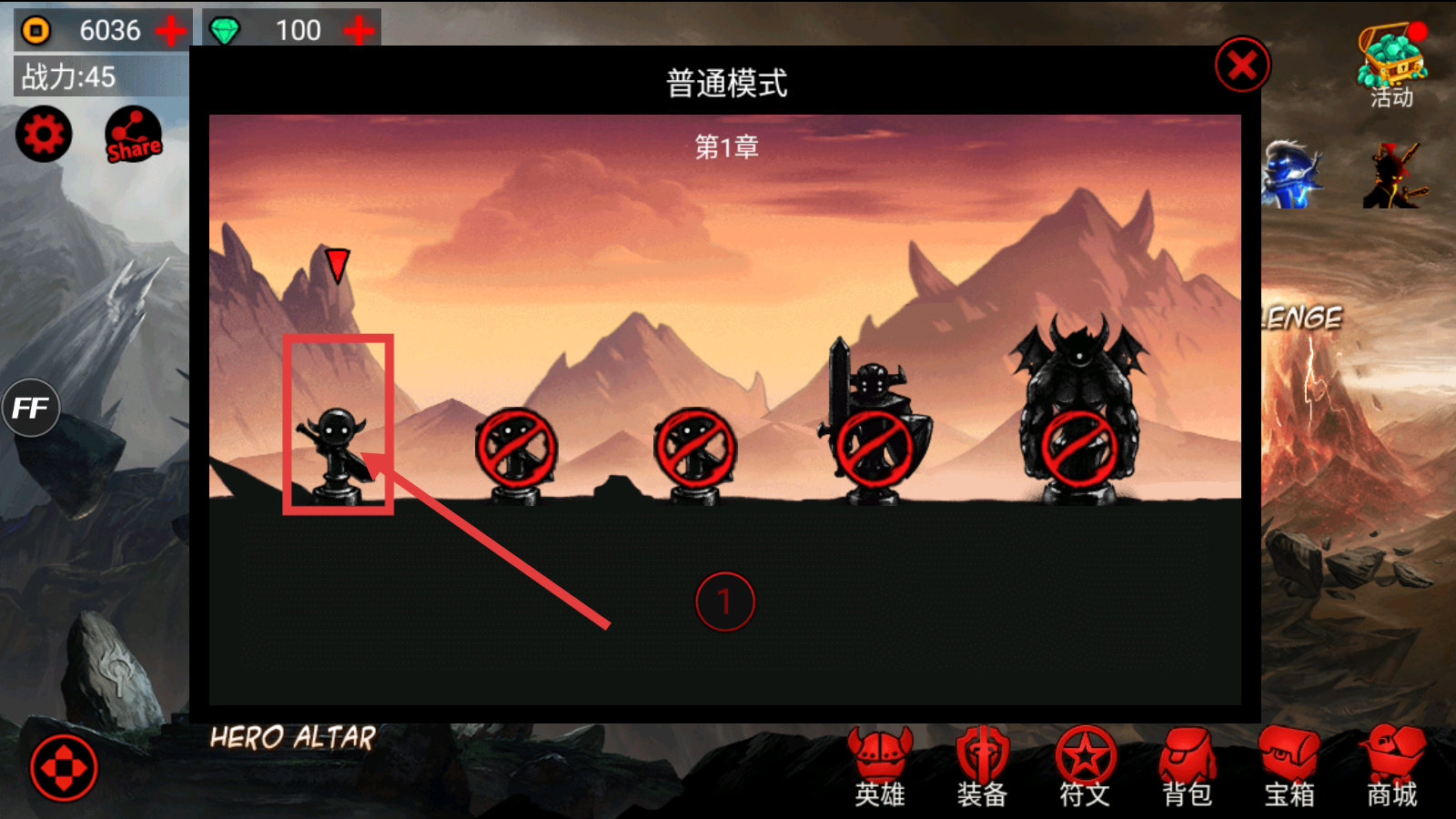 1、进入【普通模式-第1章】,选择首个可挑战敌人,开启章节战斗,逐步推进主线剧情。