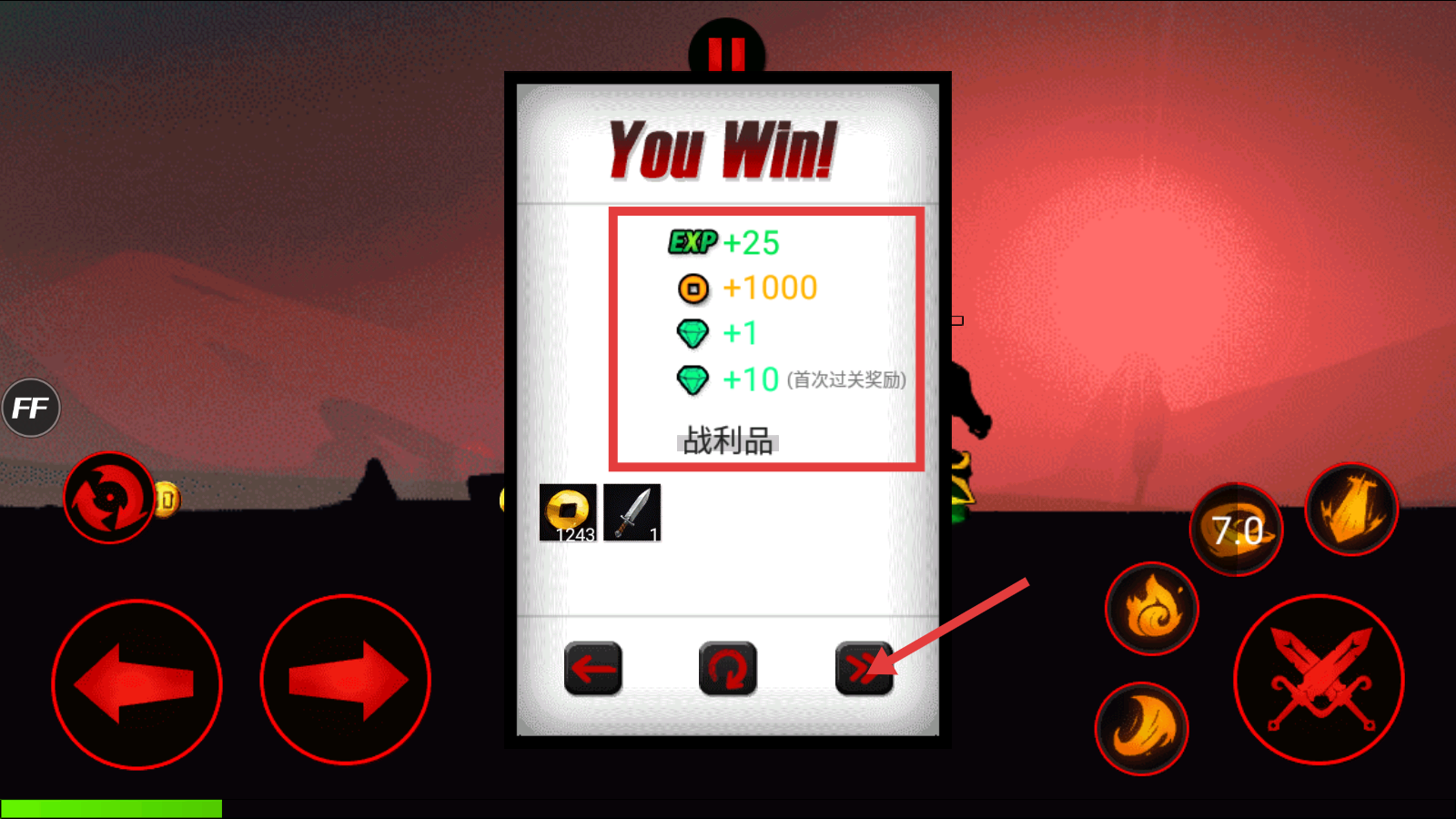 4、战斗胜利后领取【EXP+25】、金币、钻石等奖励,点击箭头继续挑战,积累资源提升战力。