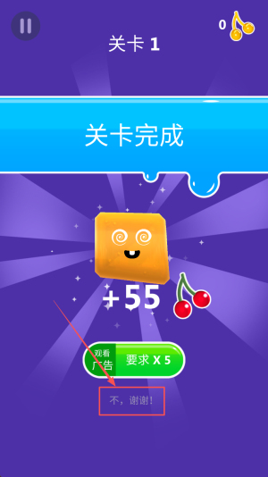 4、最后,点“观看广告”可拿5倍金币,或按“不,谢谢!”直接领取+55奖励并进入下一关。