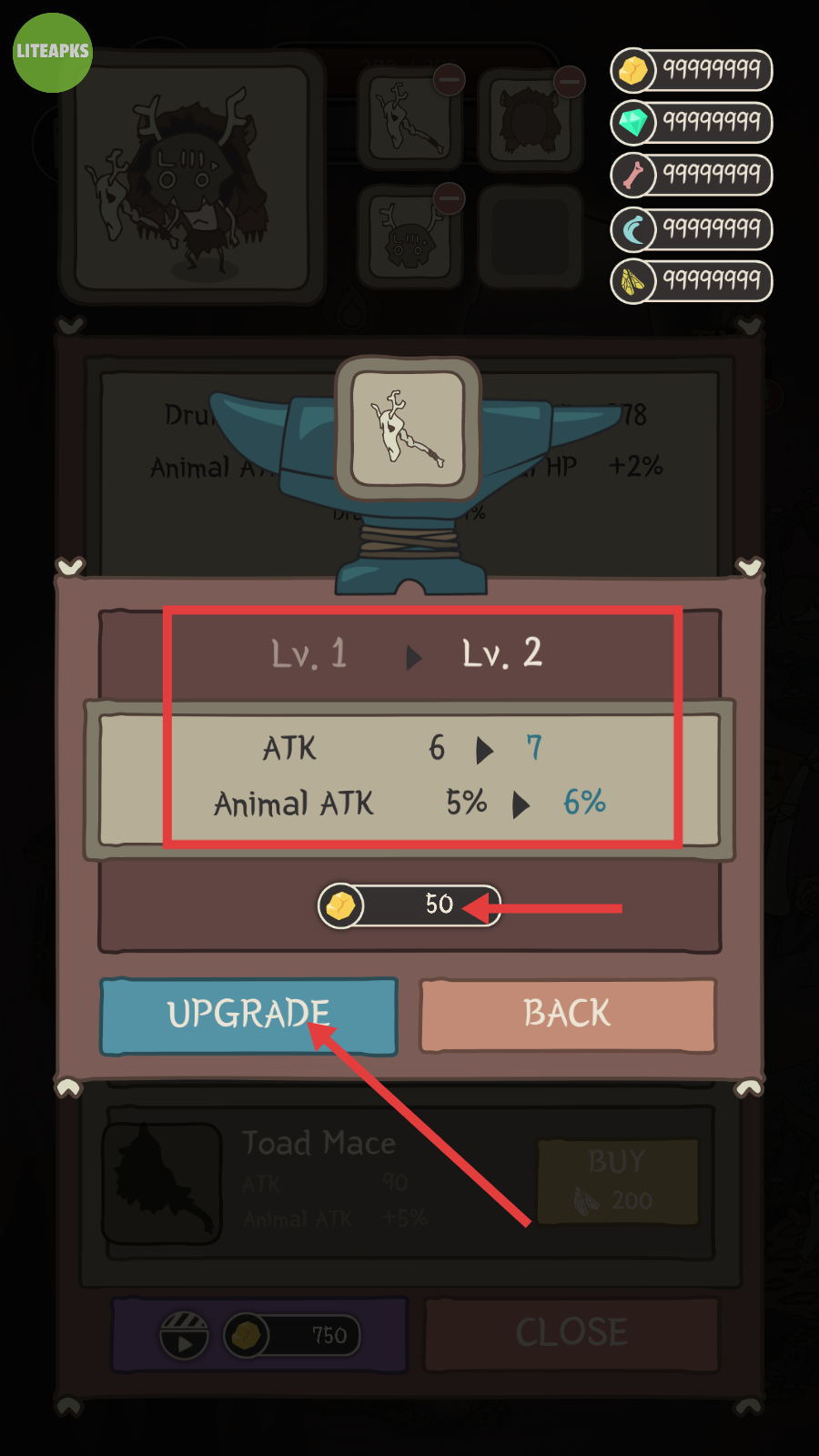 3、花费【50】金币将装备升级到【Lv.2】,提升【ATK-7】和【Animal-ATK-6%】,强化能力。