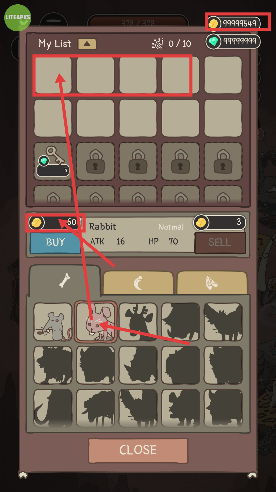 2、进入【My-List】界面,消耗【60-金币】购买【Rabbit】,填充图鉴,夯实战力成长根基。