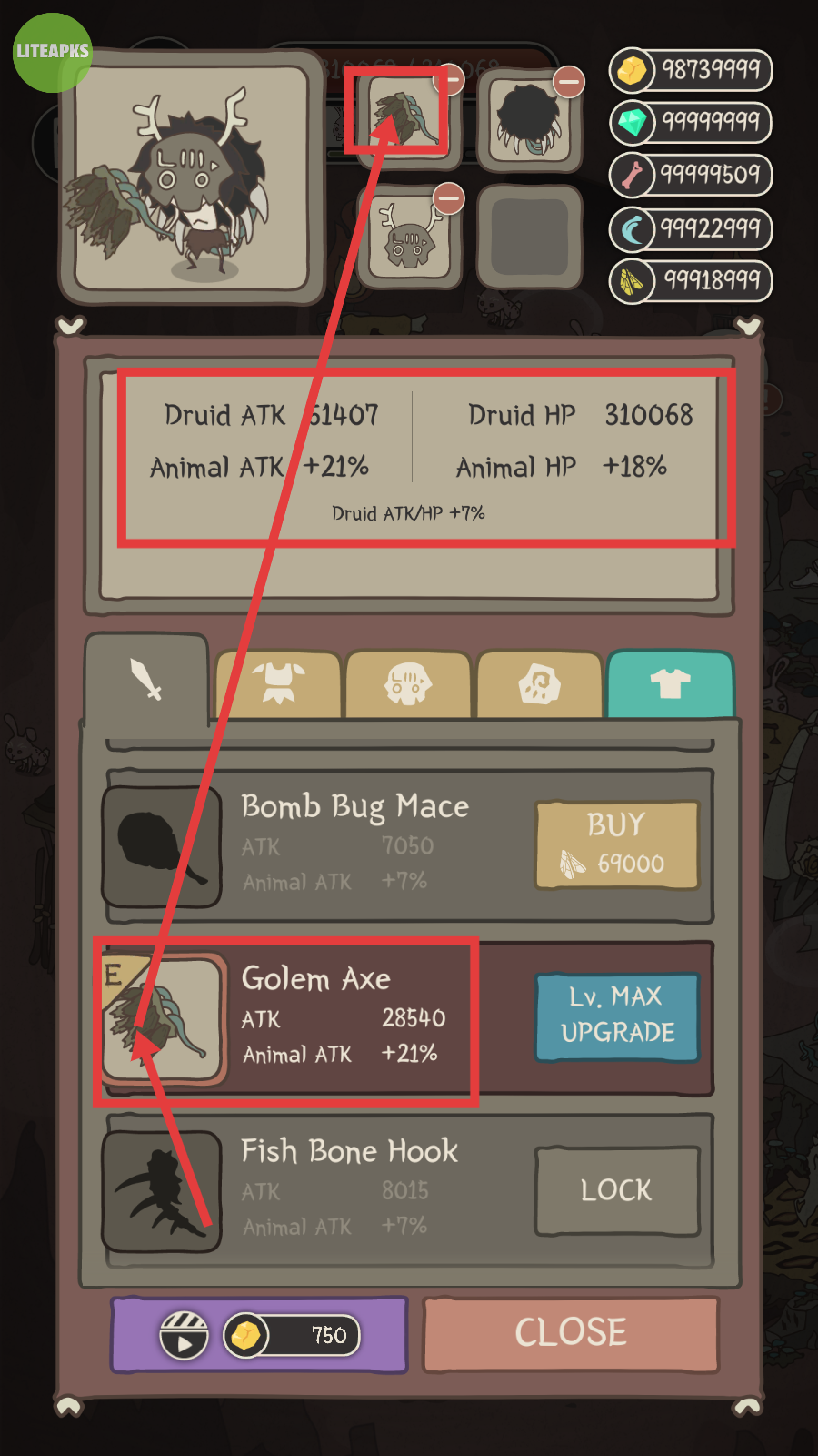3、装备【Golem-Axe】,提升【Druid-ATK-51407】与【Animal-ATK-+21%】等属性,显著强化战斗实力。