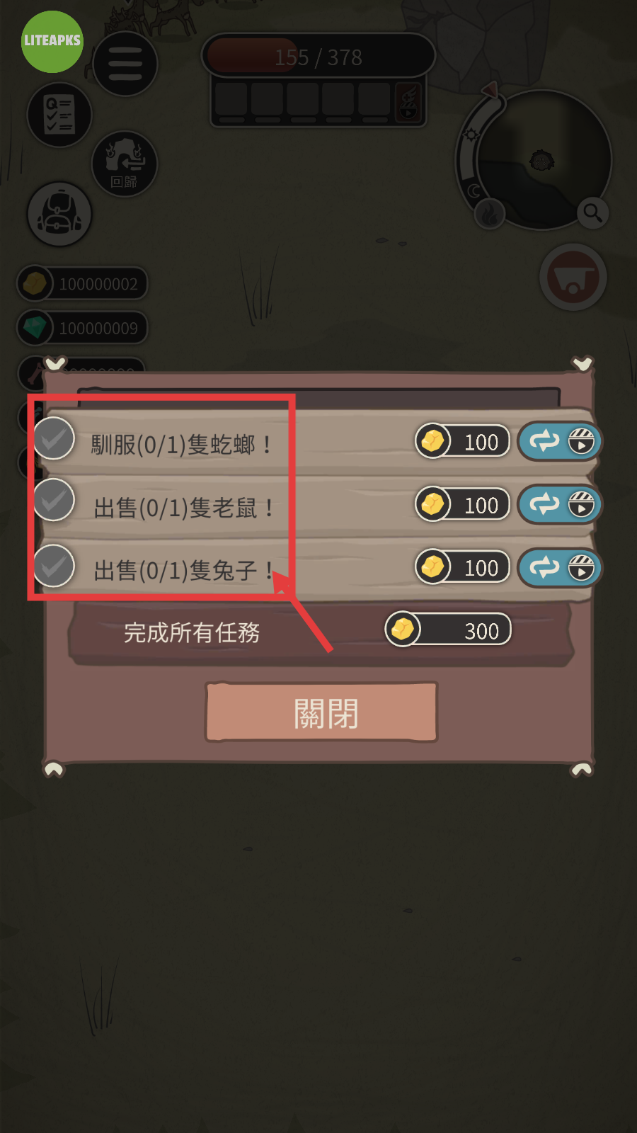 4、查看任务列表,完成【馴服(0/1)隻蛇螂】【出售(0/1)隻老鼠】等任务,获取金币奖励,加速资源积累。