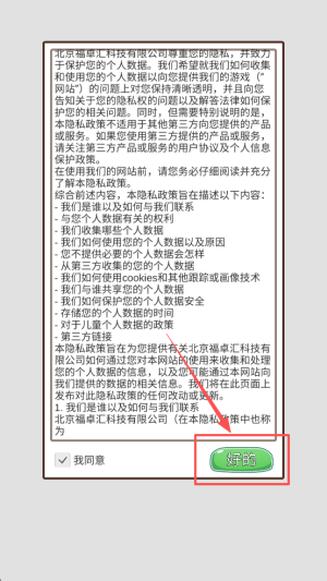 1、首先,阅读并同意隐私政策,点击“好的”按钮以进入游戏。