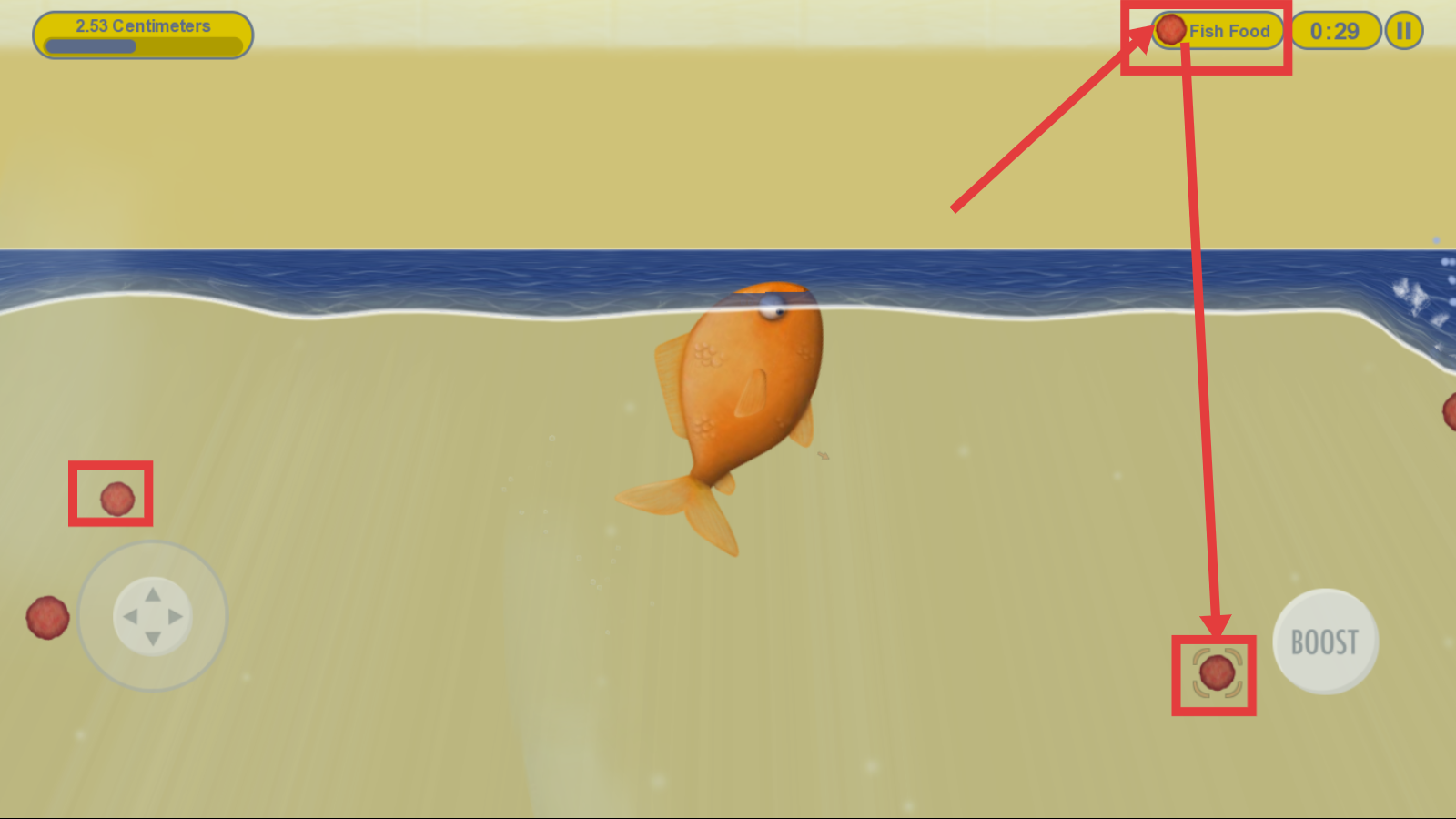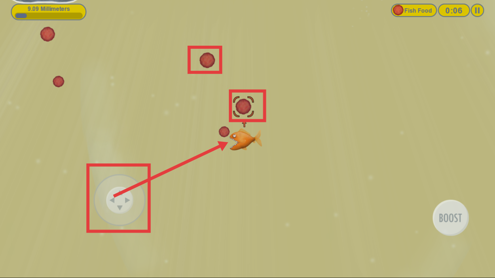 3、关注右上角【Fish-Food】时间,持续吞噬食物,合理使用【BOOST】加速,快速提升小鱼尺寸,增强吞噬能力。