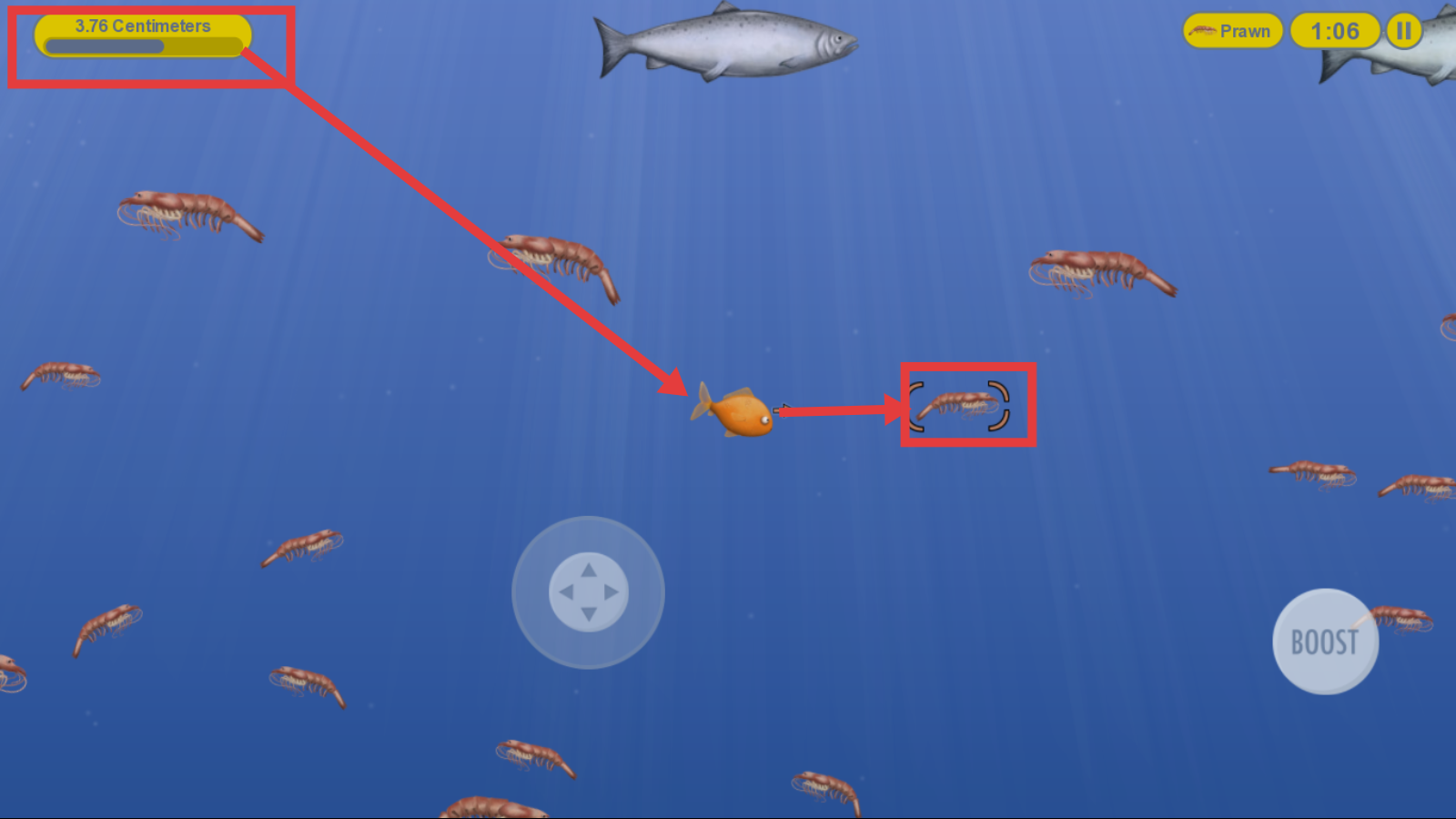 4、进入虾群区域,吞噬比自己小的虾,关注尺寸【3.76-Centimeters】的增长,通过吞噬虾类持续成长,解锁更多吞噬目标。