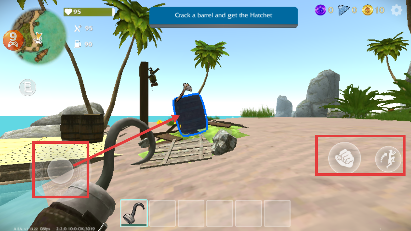 1、操控角色移动,利用【拳头】【跳跃】功能,打碎木桶获取【斧头】,完成初始工具收集任务。