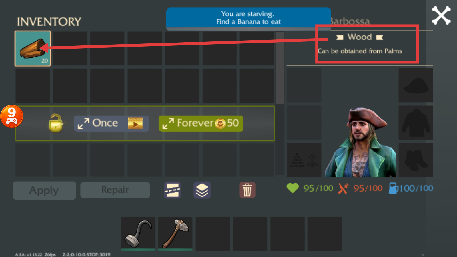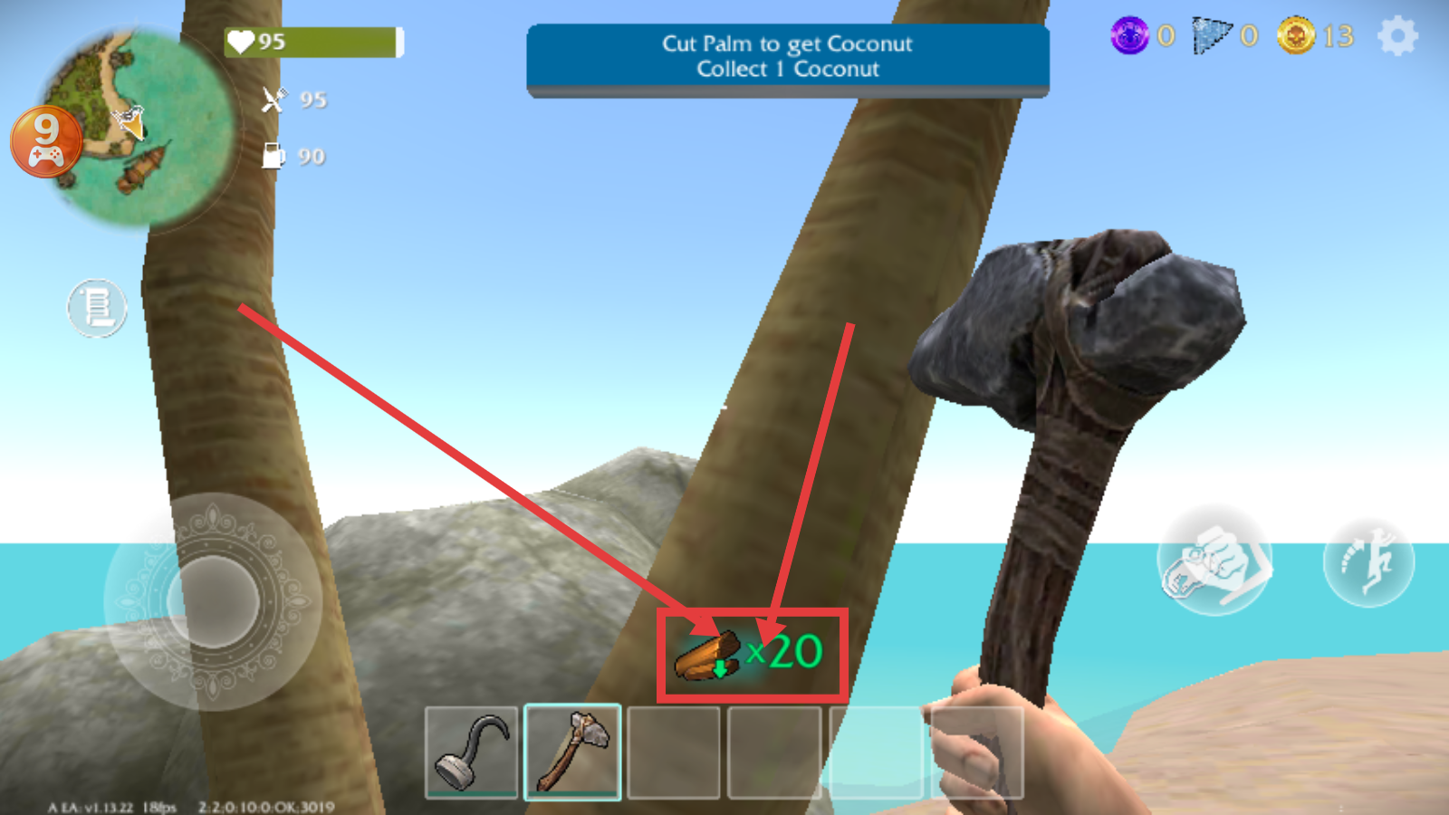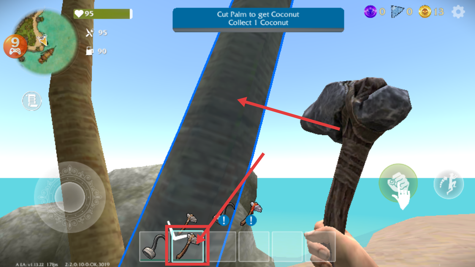2、装备【斧头】,砍棕榈树,推进【Cut-Palm-to-get-Coconut】任务,获取生存资源椰子。