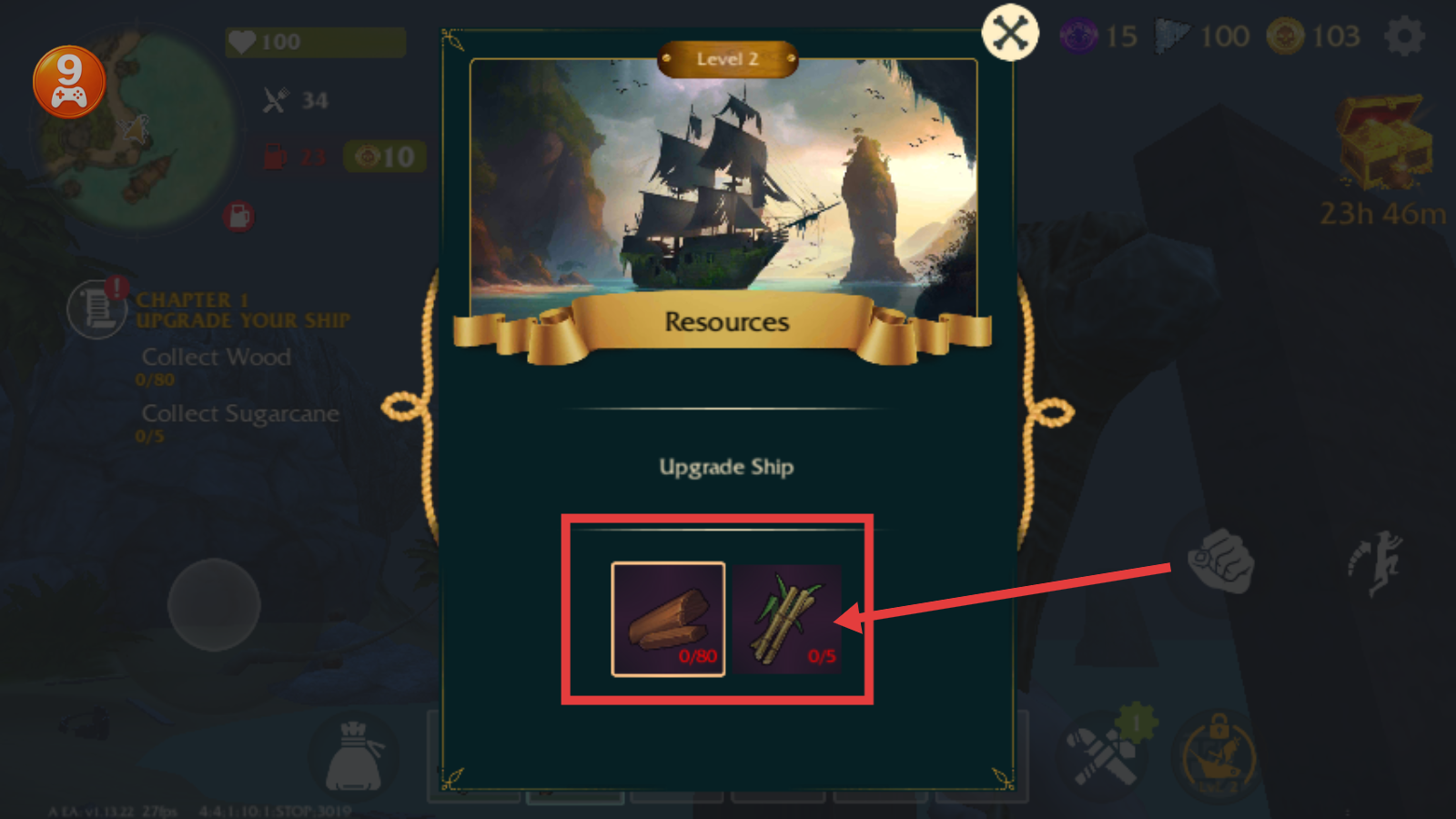 1、明确船只升级需求,需收集木材80和甘蔗5,开启资源收集任务,为船只升级奠定基础。