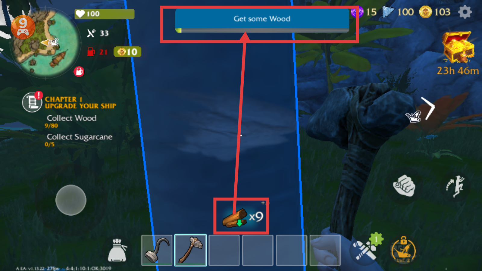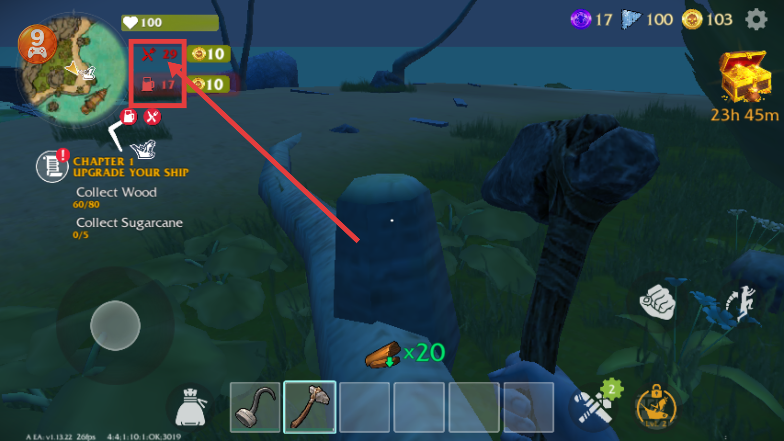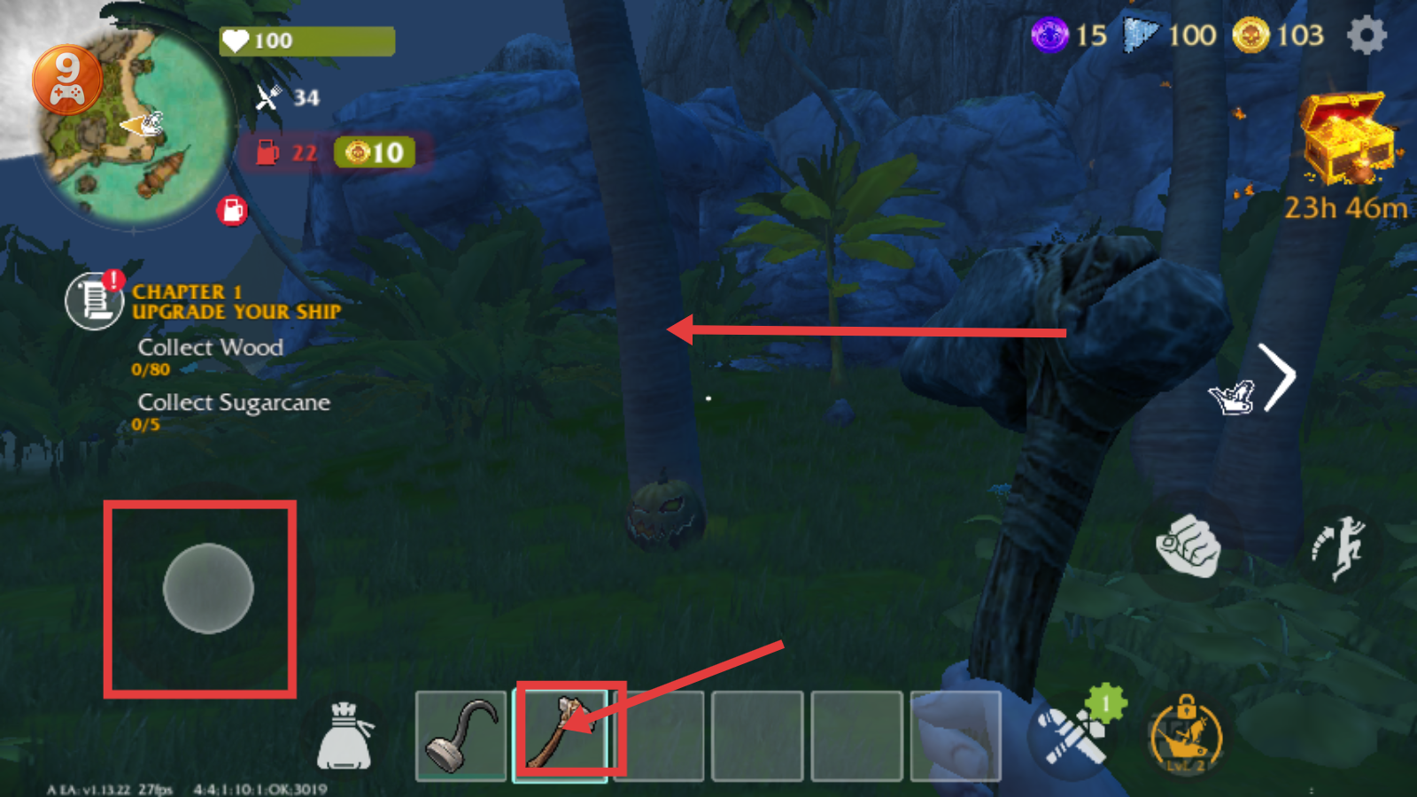4、收集完木材后,寻找甘蔗资源点,收集5个甘蔗,凑齐两种资源,完成船只升级的资源准备。